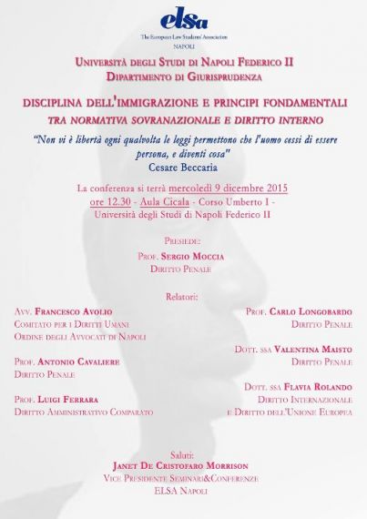In occasione dell' "HUMAN RIGHTS DAY", giornata mondiale dei diritti umani, il giorno 9 Dicembre 2015 alle ore 12,30, presso l' Aula Cicala dell' Università degli studi di Napoli Federico II, la conferenza "DISCIPLINA DELL'IMMIGRAZIONE E PRINCIPI FONDAMENTALI: tra normativa sovranazionale e diritto interno."
