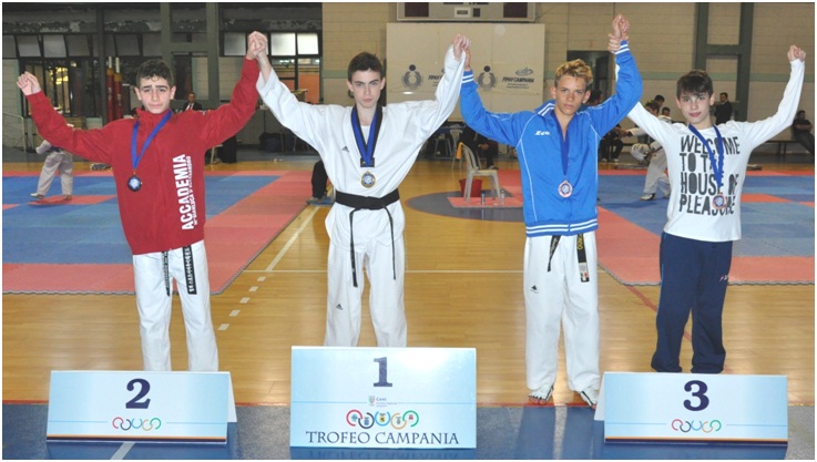 Grande prova domenica 17 Novembre da parte degli atleti irpini capitanati dal Maestro Gianluca D'Alessandro che conquistano rispettivamente 1 ORO, 1 Argento e 5 Bronzi presso il palazzetto dello sport di Barra dove si sono svolti i campionati regionali organizzati dal CONI e denominati Trofeo Campania. In gara i migliori team campani si sono dati battaglia con i giovanissimi atleti, presenti diversi ragazzi già campioni italiani ed alcuni addirittura con podi in campo Europeo. Una kermesse dunque di altissimo livello che a messo a dura prova i portacolori irpini, alcuni dei quali alla prima nella categoria delle cinture rosse e nere. La medaglia d'oro va ad Antonio Ucci, mentre l'argento - che poteva essere tranquillamente Oro se non fosse stato per un infortunio - lo conquista Danilo Lombardini che dopo aver superato brillantemente due incontri deve abbandonare la finale. Ben cinque invece le medaglie di bronzo che vanno rispettivamente a: Giannatiempo Gabriel, Melillo Manuel, Capone Christian, Demidont Mark e Pilunni Erminio. Per il M° D'Alessandro in ogni caso è stato un test positivo in vista di alcuni importanti appuntamenti come i campionati Italiani Junior e Cadetti che si terranno rispettivamente a Gennaio e Febbraio.