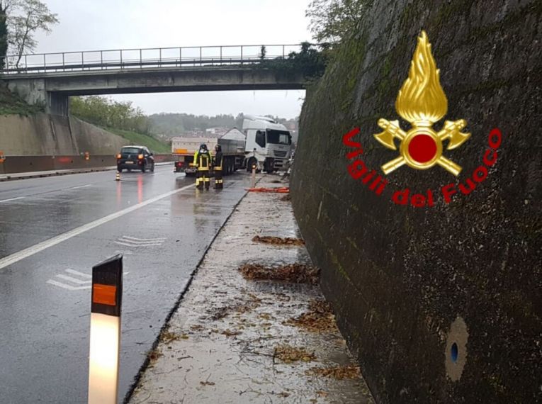 Questa mattina i Vigili del Fuoco di Avellino sono intervenuti sull'autostrada A16 Napoli - Canosa, al Km. 52,900, nel territorio del comune di Montemiletto, in direzione Canosa, per un incidente stradale che ha visto coinvolto un autotreno. Il pesante automezzo in transito sul territorio irpino è sbandato urtando contro il muro che delimita la carreggiata. Lunghe e delicate le operazioni di recupero del veicolo, anche per la rottura del serbatoio con la conseguente perdita di gasolio sulla carreggiata. Impegnata anche l'autogru della sede centrale per il recupero.
