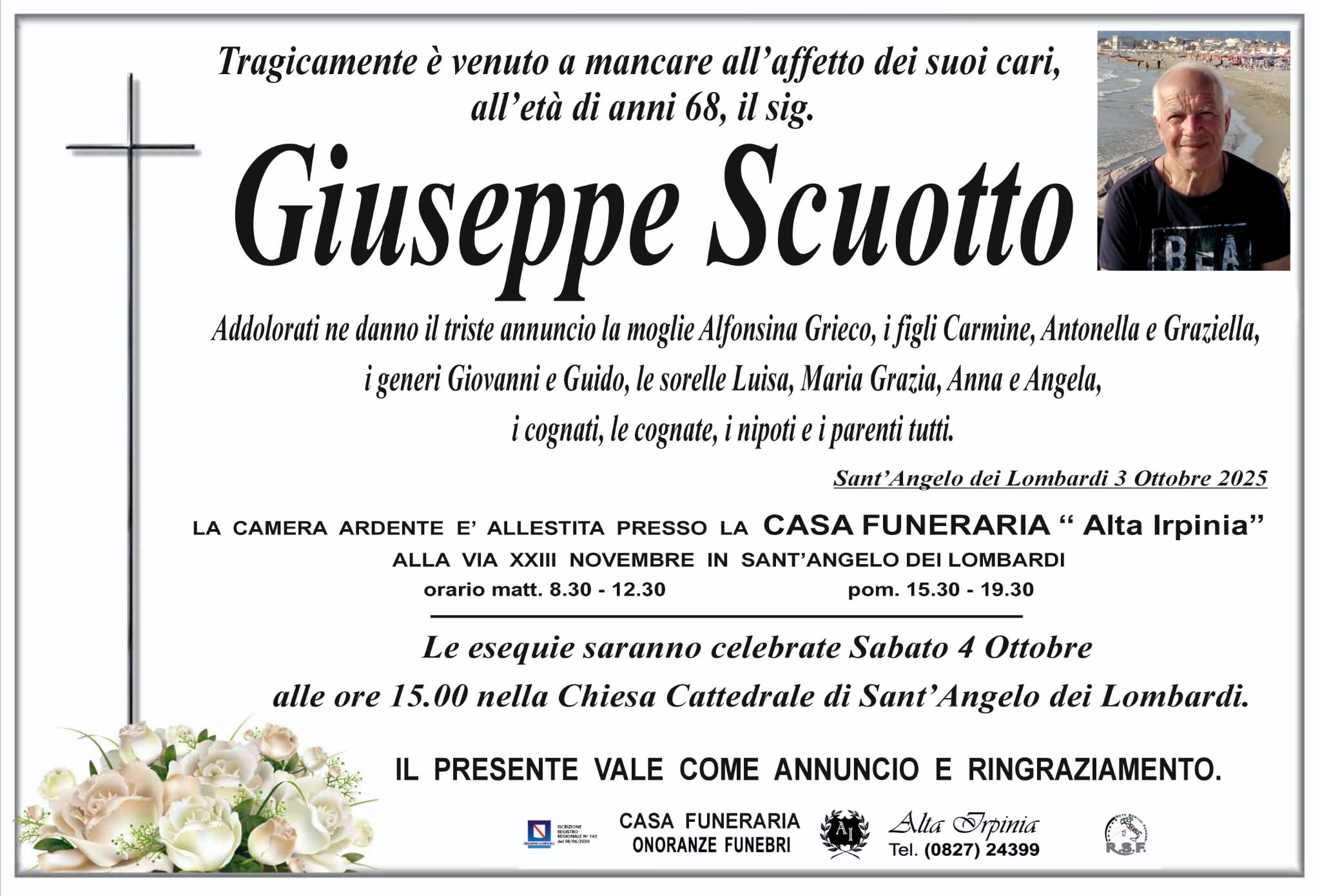 Eseguita presso il nosocomio dell'Azienda Moscati di Avellino l'autopsia sul cadavere di Giuseppe Scuotto, il 68enne scomparso lo scorso 22 agosto dall'abitazione  di Contrada Ruggiano a Sant'Angelo dei Lombardi. Si attende ora di conoscere il responso sugli esiti dell'esame autoptico.  Come è noto, il cadavere dopo circa 40 giorni  è stato rinvenuto nel pozzo nero distante circa venti metri dall'abitazione dei familiari dove alloggiava durante il periodo di ferie estive.   Con il rilascio e la restituzione della salma alla famiglia, è stata fissata la data delle esequie con la camera ardente allestita presso la Casa Funeraria Alta Irpinia. I funerali sabato 4 ottobre alle ore 15.00 nella Cattedrale di Sant'Angelo dei Lombardi.