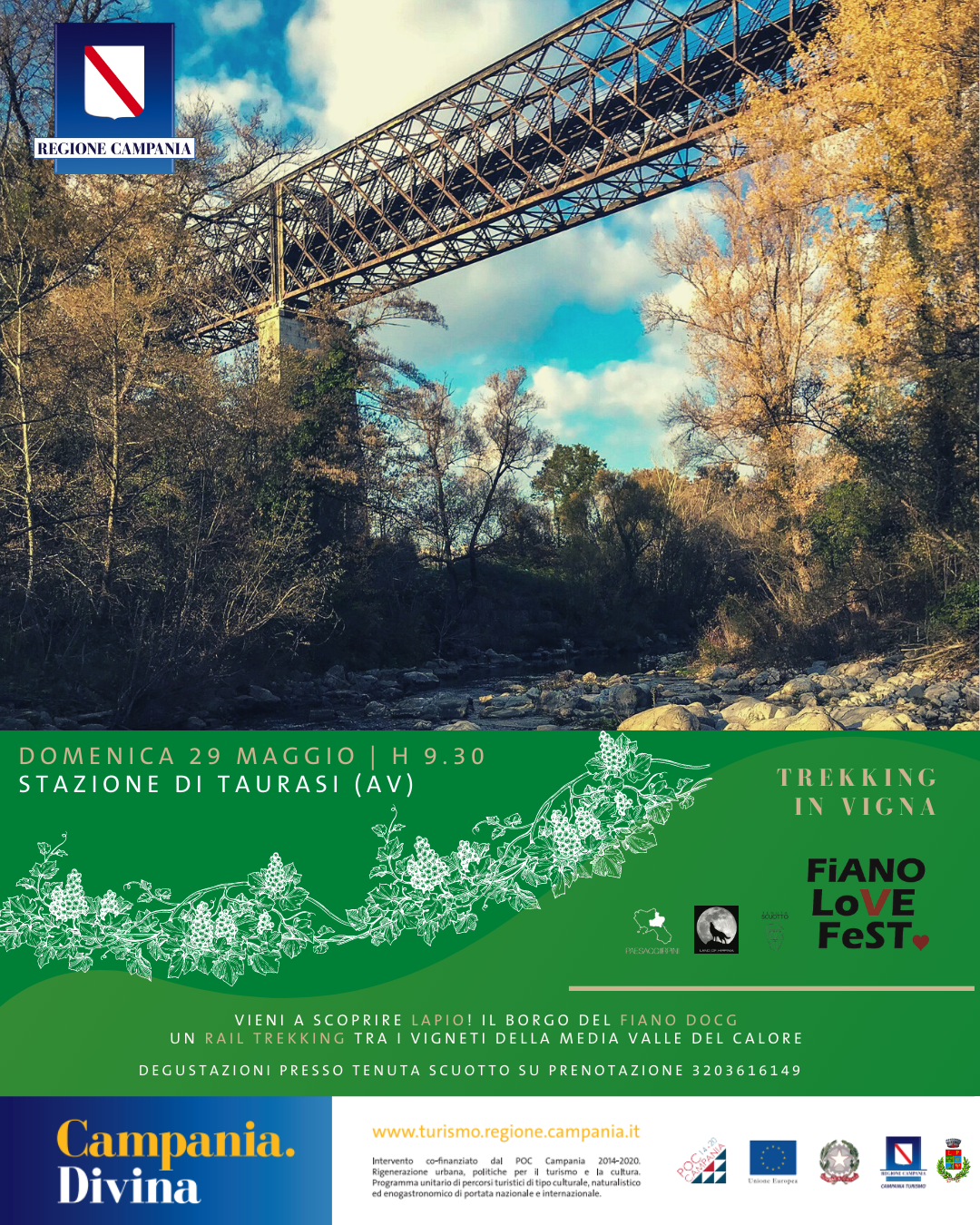 Si parte Domenica 29 Maggio 2022 con un appuntamento assolutamente da non perdere a Lapio. L’iniziativa, denominata Trekking in Vigna, nasce dalla collaborazione di Paesaggi Irpini e l’associazione Land of Hirpinia. Una giornata all’insegna della natura e delle bellezze architettoniche. Un’occasione per celebrare il buon vivere, con tante attività legate al vino e al trekking, completamente immersi nella natura e nel verde dell’Irpinia. Cultura e storia s’intrecciano nel percorso versoLapio, la patria del Fiano DOCG, nelle terre antiche del vino. Il raduno è fissato alle ore 9.00 presso la stazione di Taurasi , da cui partirà il rail trekking che viaggerà attraverso i vigneti della media Valle del Calore. Partenza alle ore 9.30. Le stazioni irpine raccontano la storia di un territorio, il paesaggio disegnato dalle vigne. Il sentiero di circa 3km è accessibile a tutti, tra vigneti di Fiano e Aglianicodel Borgo di Lapio. Si costeggerà la tratta ferroviaria storico turistica Avellino - Rocchetta Sant’Antonio, della quale si potranno apprezzare numerose opere architettoniche di fine ‘800, in primis il Ponte Principe. Si potranno ammirare bellezze naturalistiche quali il Fiume Calore. Quale luogo migliore se non Lapio, piccolo borgo che dista solo 20 km dalla città di Avellino, culla di origine del Fiano di Avellino Docg e massimo distretto viticolo per lasua produzione. Lapio, inoltre, è uno dei pochi Comuni ad avere il doppio marchio DOCG, producendo anche Taurasi. Sarà una speciale domenica di maggio, immersi nella natura, tra vigne, paesaggi fantastici, alla riscoperta della storia della ferrovia: un susseguirsi inarrestabile di sapori, odori, colori nel calore delle colline da esplorare in primavera, quando la natura brilla gioiosa, con attività legate al culto del vino. Alle ore 11.30, infatti, è prevista una degustazione di vino e prodotti tipici presso la pregiatissima e pluripremiata Tenuta Scuotto.
