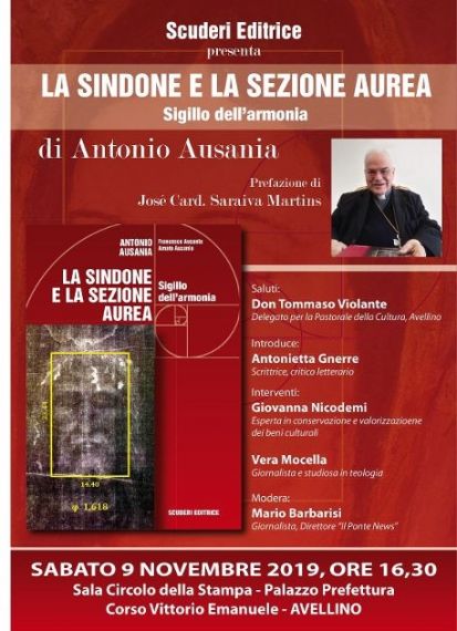 “La Sindone e la sezione aurea. Sigillo dell’armonia” di Antonio Ausania con prefazione del cardinale e arcivescovo cattolico portoghese José Saraiva Martins, è un lavoro che tratta un argomento che ha affascinato tutte le epoche, fonte inesauribile di domande culturali continuando ad essere con i progressi della conoscenza, sempre più stimolante, interrogando la storia, l’archeologia, la numismatica, la geologia, la biologia, la medicina, la fisica e con il mio saggio anche la matematica. L’autore, medico e studioso, ci accompagna sulle tracce di una testimonianza, la cui importanza trascende il semplice oggetto per divenire qualcosa che turba l’animo dell’uomo e attraverso varie ricerche documentate e analisi accurate che hanno dimostrato la presenza di pollini mediorientali sul tessuto della Sindone si rende verosimile l’idea, anche attraverso le tracce ematiche, che quello sia il volto di Cristo. La Sindone, protetta dalla violenza della guerra nel monastero benedettino di Montevergine dal 1939 al 1946, è certamente la “manifestazione più misteriosa della bellezza e dell’armonia universale”.
