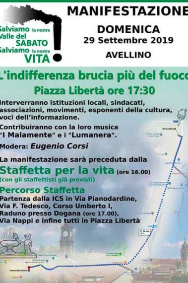 Appuntamento per domenica pomeriggio. Sarà all'insegna della Staffetta per la Vita: e' la chiamata per i cittadini e istituzioni per una mobilitazione a favore dell'ambiente e della salute. Partenza dallo stabilimento Ics di Pianodardine devastato dal rogo dello scorso 13 settembre. Ad accendere la fiaccola della speranza gli operai Ics. Una staffetta che partirà dal luogo dell'inferno del fuoco che ha distrutto la Ics per arrivare al palco dove si alterneranno parole e musiche per rivendicare il diritto alla vita per le generazioni future. Il programma presentato al circolo della Stampa dal presidente dell'associazione" Salviamo la Valle del Sabato" dott. Franco Mazza , ha già avuto il lasciapassare di molti cittadini che domani e per i giorni a venire saranno impegnati a trasmettere la piccola grande fiaccola della Vita per mettere un freno all'inquinamento e ai danni ambientali purtroppo in aumento negli ultimi anni in Città e nelle zone periferiche e industriali.