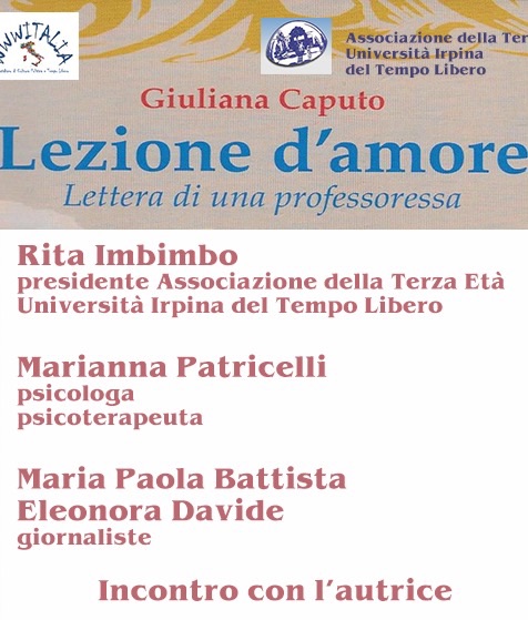 La scuola ieri e oggi. Presentazione del libro Lezione d’amore di Giuliana Caputo, edizioni Delta3, all’Università Irpina del Tempo Libero, sabato 16 novembre 2019 alle 17, ad Avellino, presso la sede in via Olindo Preziosi, 8.